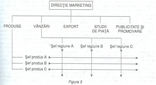 structurile de organizare vor trebui sa aiba o configuratie matriceala - pe departamente (divizii), regiuni si proiecte (fig. 3), tinand seama de oportunitatea intre marketingui strategic si organizare (fig. 4).