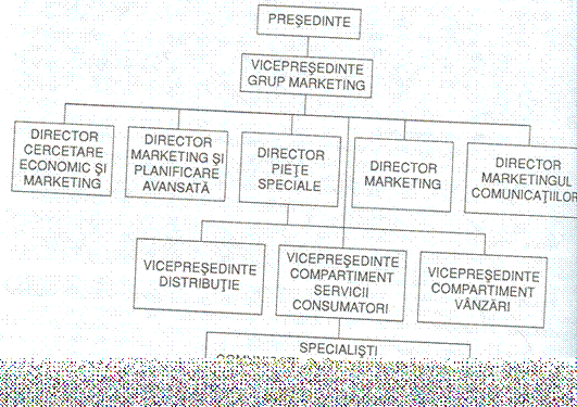 In opozitie cu aceste Iucrari, ceie de marketing recomanda, aproape in exclusivitate, constituirea structura organizatorica a unui compartiment distinct, specializat, strict delimitat de celelalte compartimente si mai ales de cel comercial, formula avand in principiu o serie de avantaje mai mult decat evidente.