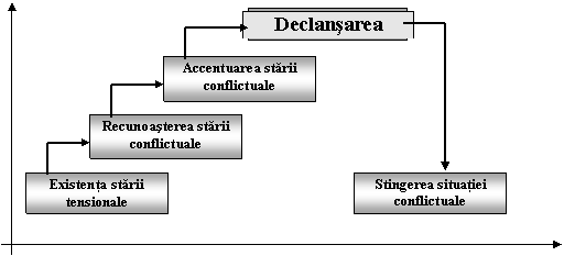 Analiza evolutiei situatiilor conflictuale arata ca declansarea conflictelor presupune acumularea treptata de tensiuni in timp. In acest sens, pot fi puse in evidenta mai multe stadii ale situatiilor conflictuale: starea tensionala (in care exista toate premisele declansarii conflictului), recunoasterea starii conflictuale, accentuarea starii conflictuale (cind se acumuleaza starea tensionala fara a se declansa insa conflictul), declansarea conflictului si incetarea conflictului.
