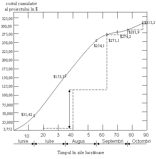 Pe acelasi grafic se traseaza costurile cumulate, efectiv realizate, la sfarsitul fiecarei luni. Singura, aceasta informatie nu este concludenta, dar daca se traseaza si graficul costului planificat (din buget) al lucrarilor deja realizate rezulta o comparatie deosebit de utila. Daca in continuarea curbei costurilor efectiv realizate se traseaza cele doua curbe in S pentru activitatile inca neefectuate, graficul permite o comparare rapida a tendintelor costului total si o comparare cu costul total planificat.