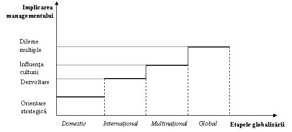 Pe masura ce o companie se implica tot mai semnificativ pe pietele externe, intr-un context international si/sau multicultural, de la export la fransiza, investitii directe in strainatate etc., sarcinile ce revin managementului, indeosebi pentru echipa de la top, sunt tot mai numeroase si complexe; in plus, riscurile asumate de administrarea unei afaceri in strainatate sunt cu mult mai ample, comparativ cu piata autohtona. Conform cu R. Daft, procesul de globalizare, privit din perspectiva firmelor, urmeaza patru faze/etape (Figura nr. 1.).