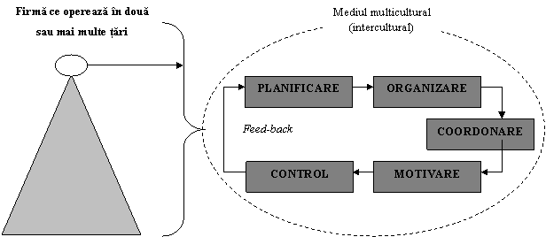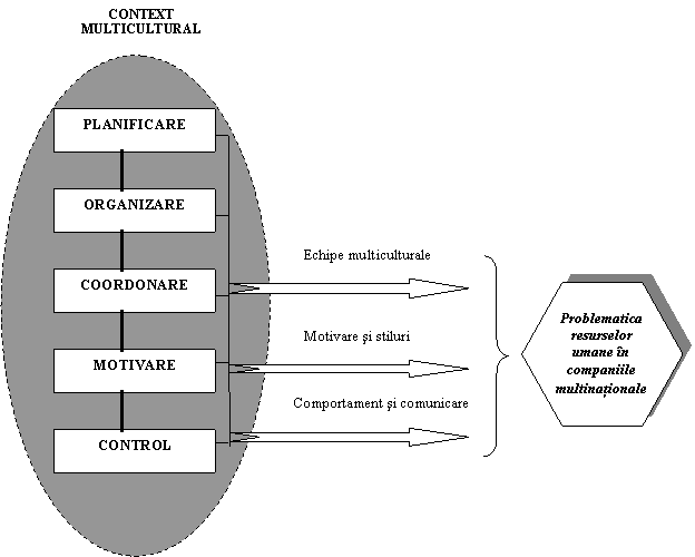 Urmare a riscurilor specifice pietelor externe, a competitiei economice dintre tarile lumii, a restrictiilor derivand din reglementarile unor organisme internationale, a contextului multicultural in care se activeaza, a unor cutume in practica afacerilor internationale etc., materializarea cu succes pentru oricare din cele cinci functii ale managementului in context international devine ceva mai dificila. Totusi, alaturi de planificare, organizare etc., problematica resurselor umane in context multicultural/international joaca un rol cu totul aparte pentru succesul unei companii implicate pe piete externe; constituirea unor echipe multiculturale, motivarea salariatilor executanti si executivi, orientarea spre obiective comune, comunicarea eficace intre grupuri formale ridica dificultati majore pentru top management.[33] "Managerii ce apartin unor culturi diferite - spune Ioan Popa - au acceptiuni diferite in ceea ce priveste"politicile de management; similar, angajatii executanti au acceptiuni diferite privind stilul de munca; neluarea in considerare a acestor diferente culturale poate conduce la un esec pe pietele externe. In figura nr. 7. se sugereaza grafic problematica aparte a resurselor umane in context multicultural/international.
