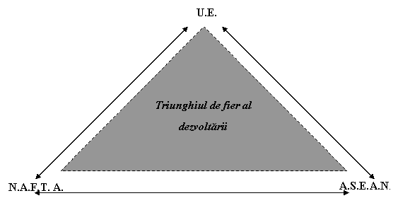 Prin analogie cu triunghiul de fier al globalizarii invocat anterior, putem discuta de triunghiul de fier al dezvoltarii, constituit din cele trei grupari economice (figura nr.4.); aceste trei mari grupuri economice, care detin o formidabila putere politica, comerciala, financiara si stiintifica, vor continua sa imprime anumite trenduri in evolutia economiei globale si in ceea ce priveste practicile/regulile de competitia dintre MNC-uri; pentru Romania un rol major urmeaza sa il joace piata comunitara care, treptat, va obliga firmele romanesti sa isi modernizeze practicile de management zilnic.