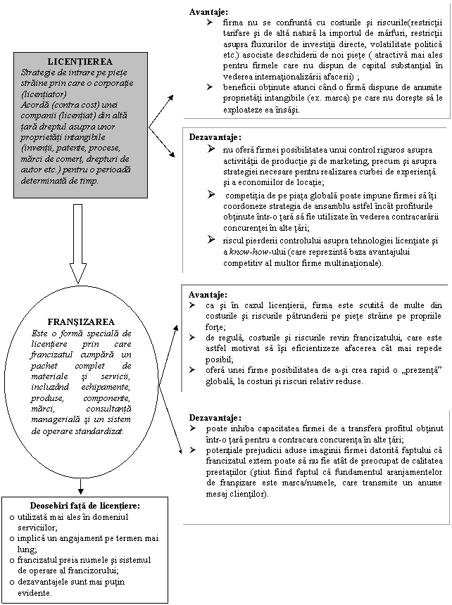 Licentierea si fransizarea ofera unei firme un acces relativ facil la piata internationala la un cost scazut, dar ii limiteaza controlul asupra dezvoltarii afacerii.[30]