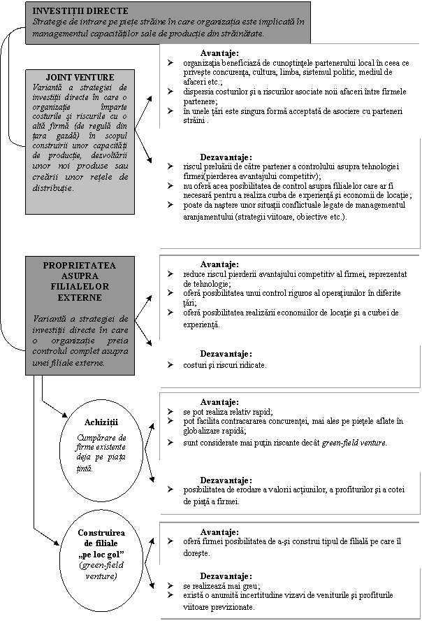 Cea mai riscanta si mai costisitoare modalitate de internationalizare este asa-numita investitie directa "pe loc gol" (green-field venture) prin care o companie isi construieste o filiala in strainatate. Caracteristicile, avantajele si dezavantajele fiecareia din modalitatile prin care o companie isi poate extinde afacerile la nivel international sunt prezentate in figura nr.6.