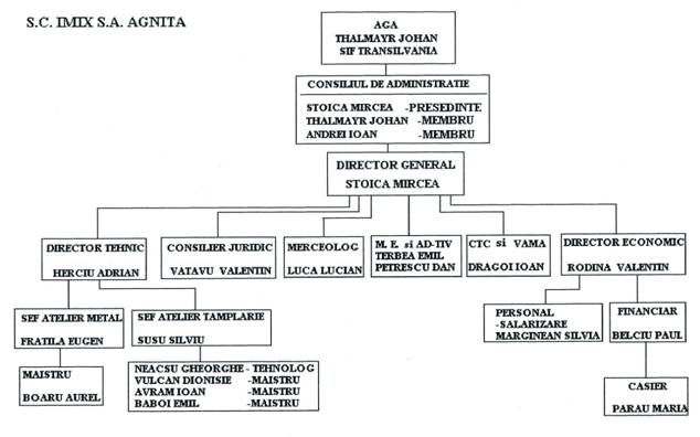 In cadrul S.C. IMIX S.A. structura organizatorica se desfasoara pe mai multe compartimente, mai exact sase, caracteristicile, modul de functionare si relatiile dintre ele fiind urmatoarele: