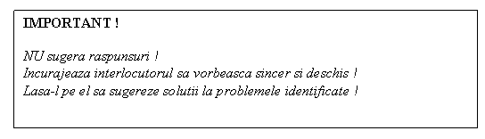 Atmosfera deschisa: in prima faza managerul va asigura o atmosfera destinsa, de colaborare si va incerca sa detensioneze angajatul.