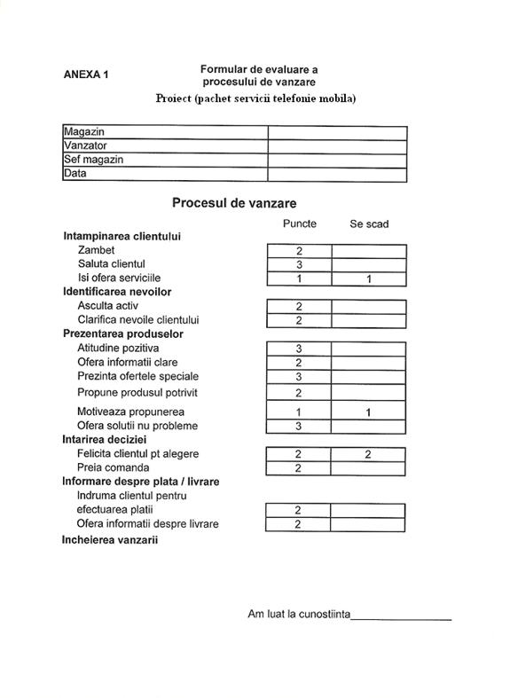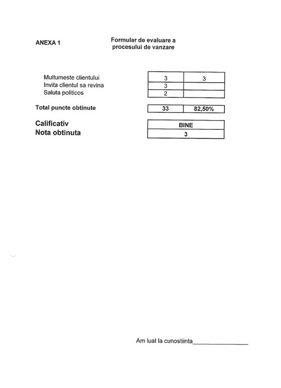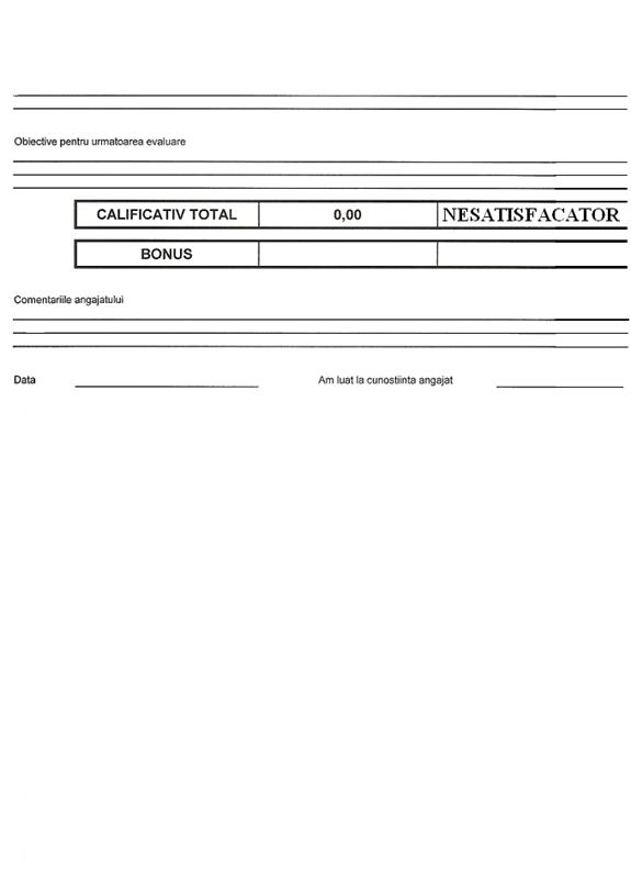 Rezultatul obtinut va fi adus la cunostinta evaluatului iar formularul trebuie semnat de catre acesta pentru a atesta ca a primit feedback-ul. Evaluatul va primi si el un exemplar completat al acestui formular de evaluare.