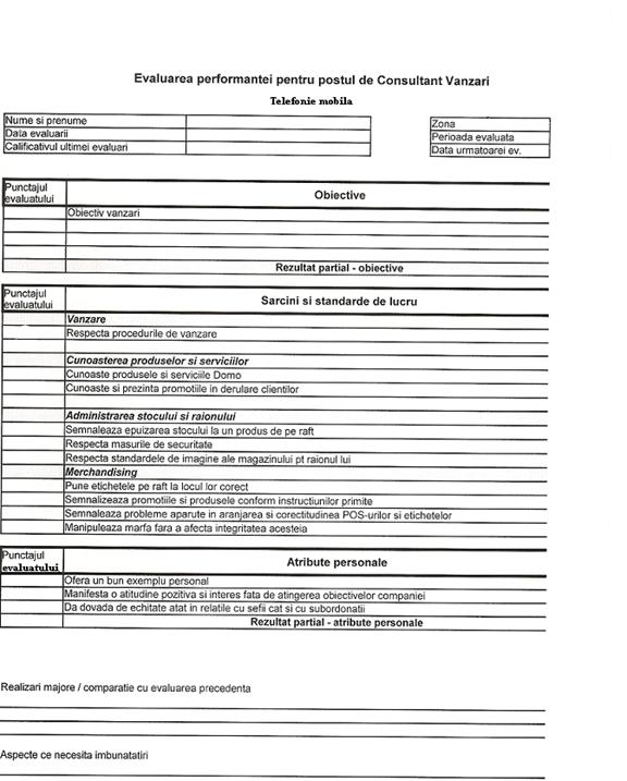 Aspecte ce necesita imbunatatiri - in aceasta rubrica se vor oferi indicatii angajatului referitor la aspectele activitatii sale pe care compania le doreste a fi imbunatatite precum si modalitatile prin care se poate realiza acesta imbunatatire.
