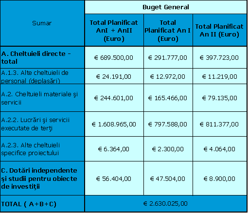 Costuri estimate proiect: 2.630.025 euro, dintre care 800.000 euro co-finantare si 1.830.025 euro finantare.