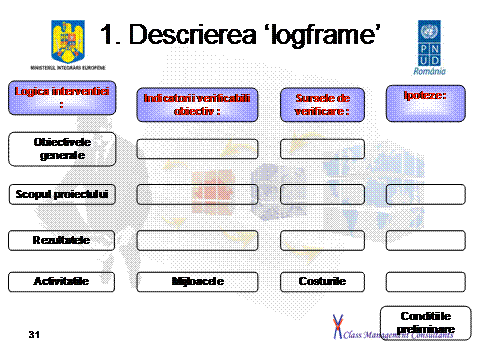 Planificarea implementarii proiectului, pe baza unui cadru de analiza logica.