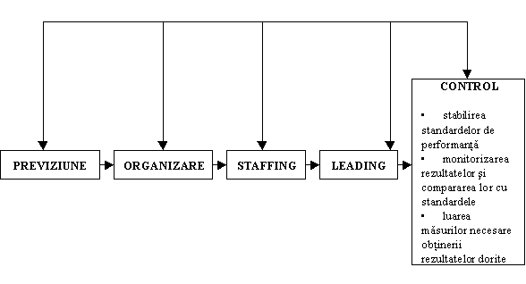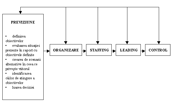 Procesul de management consta din: 'ansambluri de activitati relativ independente care se succed intr-o anumita ordine in timp si care sunt efectuate de orice subiect conducator ce exercita o influenta rationala asupra obiectului condus in vederea stabilirii obiectivelor si a realizarii lor' [35]. Cunoasterea si intelegerea functiilor managementului constituie o premisa pentru insusirea si utilizarea judicioasa a sistemelor, metodelor, tehnicilor, procedurilor si modalitatilor proprii managementului.