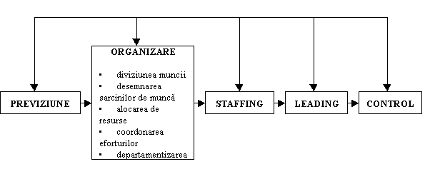 Identificarea functiilor manageriale. Procesul de conducere consta din cinci functii manageriale care ajuta organizatia in realizarea obiectivelor ei. Cele cinci functii sunt: planificarea-previziunea - care se refera la stabilirea obiectivelor, formularea politicilor si stabilirea legaturilor; organizarea - care consta in gruparea sarcinilor si alocarea resurselor si a responsabilitatilor; staffing-ul - care se ocupa de recrutare, selectie si perfectionare profesionala; leading-ul - care reprezinta procesul de mobilizare, antrenare si orientare al angajatilor; controlul - care se concentreaza pe actiunile de monitorizare a performantei si de luare a actiunilor corective necesare pentru atingerea obiectivelor propuse. Succesul unei organizatii in general si al unei firme in special depinde de cat de bine sunt realizate aceste functii.