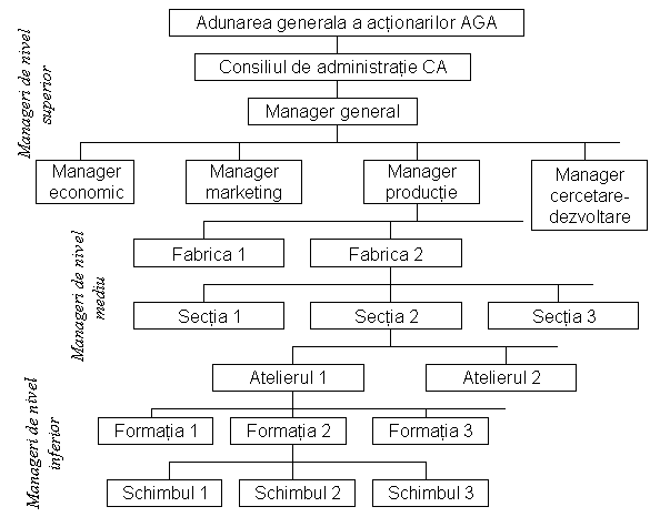 Explicarea diferentelor dintre nivelele de management. Dupa nivelul ierarhic pe care se situeaza, managerii pot fi clasificati in trei categorii: managerii de nivel inferior (de linie sau operationali) - care lucreaza direct cu executantii, coordonand munca persoanelor care nu au atributii de conducere; managerii de nivel mediu - care coordoneaza activitatea unei subunitati (productie, marketing etc.) si pot avea in subordine atat executanti directi cat si alti manageri; managerii de nivel superior (de varf) - sunt reprezentati de un grup relativ restrans de manageri care au in subordine toate celelalte nivele ierarhice din firma.
