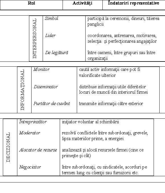 Explicarea rolurilor manageriale. Rolul managerial reprezinta un set de comportamente asociate unei anumite functii sau pozitii ierarhice. Succesul unei firme depinde in mare masura de cat de bine sunt indeplinite aceste roluri manageriale. Rolurile manageriale se impart in trei categorii: roluri interpersonale (figurant, lider, de legatura); roluri informationale (monitor, diseminator, purtator de cuvant) si roluri decizionale (intreprinzator, moderator, alocator de resurse, negociator).