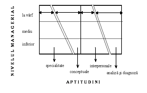 Identificarea celor patru aptitudini manageriale principale. Aptitudinea manageriala reprezinta o insusire care conditioneaza obtinerea unei anumite performante. Pentru a-si indeplini cu succes sarcinile, managerii se bazeaza pe patru tipuri de aptitudini: de specialitate (profesionale) - care definesc competenta unei persoane intr-un anumit domeniu; interpersonale - reprezentate de abilitatea de a comunica cu oamenii (angajati, clienti, furnizori etc.); conceptuale - care permit managerului sa inteleaga relatiile dintre diferitele sarcini din interiorul unei firme, ceea ce ii ofera posibilitatea de a anticipa potentiale probleme care s-ar putea ivi in viitor si de analiza si diagnoza - reprezinta abilitatea managerului de a identifica cel mai apropiat raspuns la o situatie data.