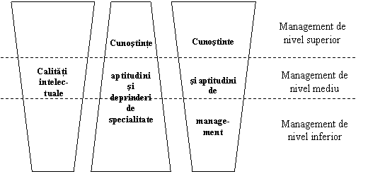 Raportul dintre cunostintele de specialitate si cele de management este determinat de nivelul ierarhic pe care se gaseste situat postul respectiv de manager. Astfel, la nivelurile de mijloc si de jos managerii trebuie sa posede mai multe cunostinte profesionale, iar la cele de varf, mai multe cunostinte de management, asa cum se observa in fig. 1.
