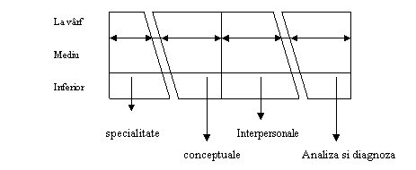 In conformitate cu figura 2, pentru managerii din varf cunostintele de specialitate sunt mai putin importante, deoarece acestia consuma putin timp in acest sens, ei concentrandu-se pe probleme majore de larga perspectiva ale organizatiei, deci, se impune ca acestia sa aiba aptitudini conceptuale si de analiza si diagnoza deosebite.