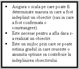 Criteriile de evaluare constituie elemente concrete cu ajutorul carora pot fi masurate rezultatele care au fost obtinute efectiv, in raport cu obiectivele propuse initial in cadrul unui proiect, plan. program.