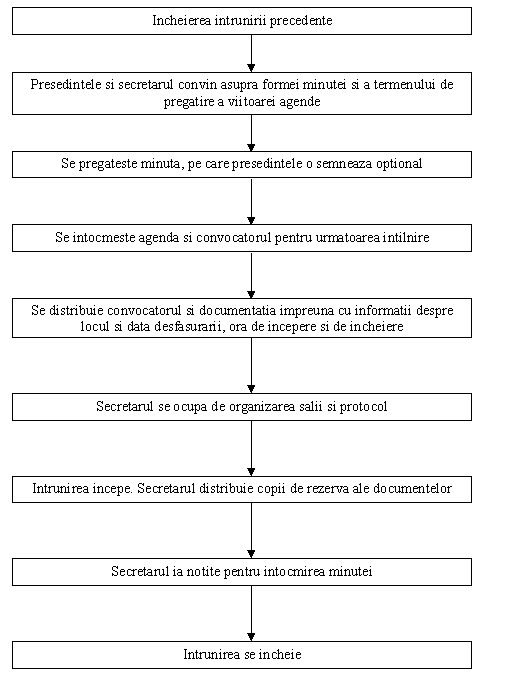 Inainte de sedinta, pentru asigurarea desfasurarii statutare, trebuie intreprinse anumite actiuni care duc la realizarea unei intruniri de succes. Prin parcurgerea acestor pasi va veti asigura ca intrunirea organizata de dvs. nu va fi "o alta pierdere de vreme".