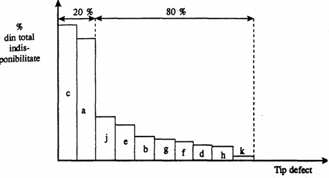 Pe baza tabelului centralizator, se vor scoate in evidenta defectiunile cu impact puternic asupra timpului de indisponibilitate, aratand cum 20% din acestea conduc la 80% din rezultatul total.