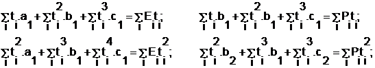 E(t) = 6170 + 3901 t - 22 t2; P(t) = 1455 + 687 t + 7,6 t2 (4)