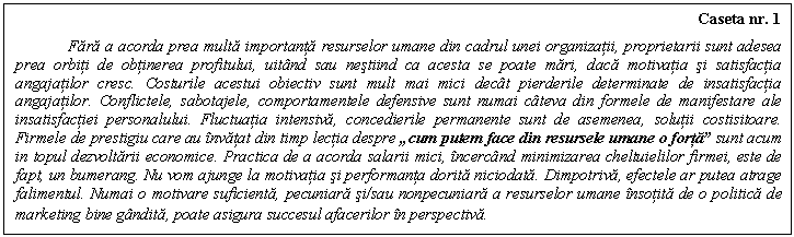 Resursele umane sunt pentru firma mult mai mult decat o sursa de costuri sau de consum. Ele pot asigura excelenta dar si dezastrul firmei. Eficienta lor depinde de priceperea si pasiunea managerilor in munca cu oamenii, dar si de sistemul motivator practicat.