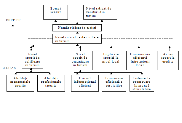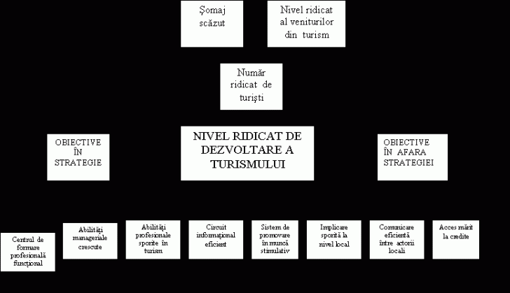 Strategia aleasa la Studiul de caz - Euroturism, cuprinde, dupa cum se poate vedea in figura de mai jos, obiectivele generale ("somaj scazut, Nivel ridicat al veniturilor din turism, Numar ridicat de turisti"), situate pe nivelul superior al arborelui obiectivelor, obiectivul central al proiectului ("Nivel ridicat de dezvoltare in turism"), situat pe nivelul mediu al arborelui si obiectivele imediate ("Centru de formare profesionala functional, Abilitati manageriale sporite, Abilitati profesionale sporite in turism, Un circuit informational functional, Mod de promovare corespunzator"), situate pe nivelul inferior al arborelui in partea stanga.