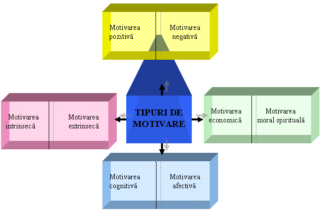 Motivarea este definita ca fiind mijlocul de a satisface o nevoie. Unele motive sunt invatate (cultivate) in societate (de exemplu a dori sa te casatoresti), iar altele sunt instinctive (a dori sa mananci cand esti flamand).In teorie si practica exista mai multe tipuri de motivare, grupate perechi: - motivarea pozitiva si motivarea negativa;