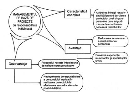 a. Management pe baza de proiect cu responsabilitate individuala (fig. 3.2). In esenta, acesta se caracterizeaza prin atribuirea intregii responsabilitati pentru derularea proiectului unei singure persoane, care asigura intreaga munca de coordonare. Pentru realizarea proiectului, managerul acestuia se sprijina pe responsabilii desemnati pentru efectuarea actiunilor implicate in compartimentele unitatii. Un atare mod de organizare a M.P.P. prezinta avantajele reducerii la minimum a cheltuielilor cu personalul si folosirii experientei muncitorilor si specialistilor firmei. Concomitent, M.P.P. cu coordonarea individuala incumba si dezavantaje majore. Personalul pus la dispozitie si compartimentele nu sunt intotdeauna de calitate corespunzatoare, cunoscuta fiind tendinta ca sefii sa se dispenseze cu prioritate de persoanele mai putin pregatite sau insuficient de sarguincioase. Alt dezavantaj consta in nedegrevarea corespunzatoare a personalului implicat in realizarea proiectului de efectuarea sarcinilor precedente, de unde si probabilitatea apreciabila a neglijarii executarii sarcinilor aferente proiectului. Date fiind dezavantajele mentionate, acest mod de organizare a M.P.P. este folosit intr-o proportie mai redusa, de obicei cand exista un personal foarte bun in intreprindere, care a mai participat si la realizarea altor proiecte.