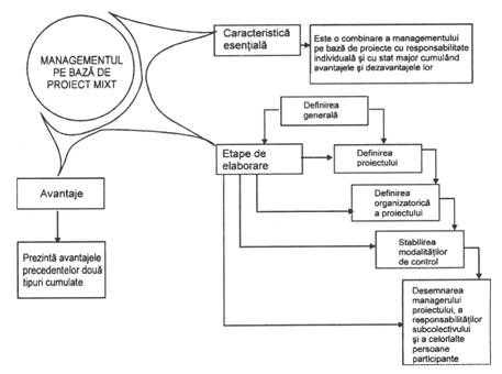c. Management pe baza de proiect mixt (fig. 3.4) reprezinta, evident, o imbinare a precedentelor tipuri de M.P.P. cumuland intr-o anumita masura atat avantajele, cat si dezavantajele acestora. La fel ca si precedenta modalitate organizatorica, M.P.P. mixt este utilizat cu o frecventa ridicata in intreprinderile din tarile dezvoltate.