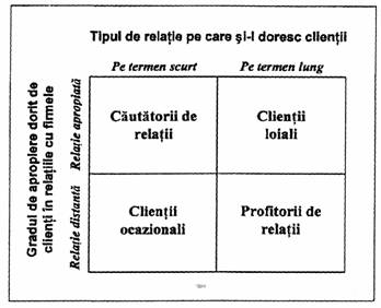 O modalitate de definire a tipului de relatie pe care clientii doresc sa o intretina cu firmele este matricea tipologiei relatiilor[7], care evidentiaza daca acestia doresc ca relatia lor cu organizatia sa fie de lunga sau scurta durata, apropiata sau distanta, (figura 2.3).
