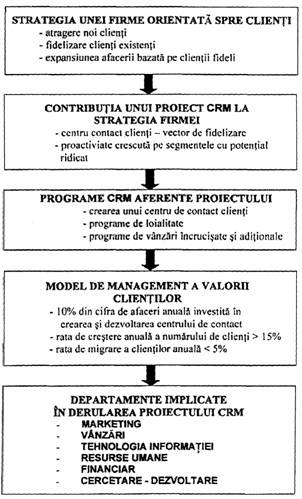 Aceste patru etape presupun crearea unui proiect managerial care sa implice specialisti in marketing, resurse umane, cercetare-dezvoltare, finante si tehnologii informatice si a unei infrastructuri informatice specifice, care sa permita gestiunea eficienta a datelor referitoare Ia clienti, stocate in depozite de date CRM.
