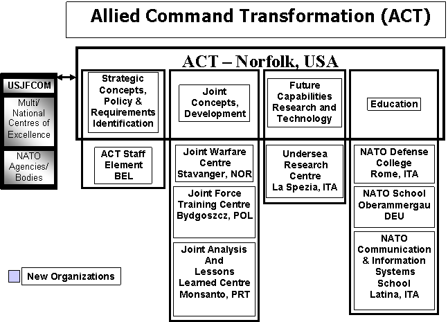 Comandamentul Aliat pentru Transformare (ACT) este situat in Statele Unite si este preocupat mai ales cu transformarea capabilitatilor militare ale NATO necesare indeplinirii intregii game de noi misiuni incredintate.