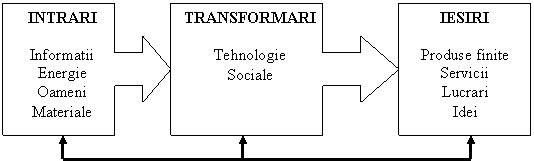 Transformarile sunt reprezentate de procesele tehnologice, sociale, prin care se obtin iesirile. Procesele tehnologice cuprind toate operatiile de productie menite sa conduca la transformarea materiilor prime, materialelor etc., in iesirile care reprezinta obiectul de baza al intreprinderii. Procesele sociale constau in relatiile dintre oameni, care iau nastere in procesul muncii. Iesirile sunt rezultatul transformarilor din sistem, care au ca destinatie mediul extern. Ele se concretizeaza in produse, servicii, lucrari, informatii, care pot si ele sa prezinte sub diferite forme, in functie de specificul intreprinderii respective.