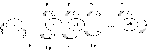 Capitalul jucatorului A variaza intre valoarea initiala zero si (a+b), crescand succesiv in pasi de unu si cu probabilitatea (p) sau scazand cu probabilitatea q=(1-p). Probabilitatea de crestere sau descrestere a capitalului nu este dependenta de numarul de trageri (n).