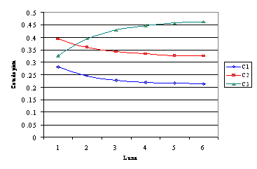 Considerand constante probabilitatile de tranzitie, se analizeaza evolutia ponderii pe piata a celor trei produse pentru un semestru. Se stabilesc politicile manageriale pentru fiecare produs in parte, la firma care-l produce.