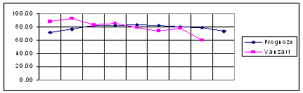 Reprezentarea grafica a evolutiei vanzarilor efective si a previziunilor, poate fi facuta, ca mai jos: