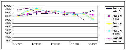 Din exemplele de mai sus se constata ca, valori a lui apropiate de 1 fac ca valoarea previziunii sa se apropie foarte mult de valoarea vanzarilor reale din ultima perioada, din care se are la dispozitie inregistrari statistice. Daca se apropie de zero, valoarea previziunii se indeparteaza mult de valoarea reala a ultimelor vanzari.