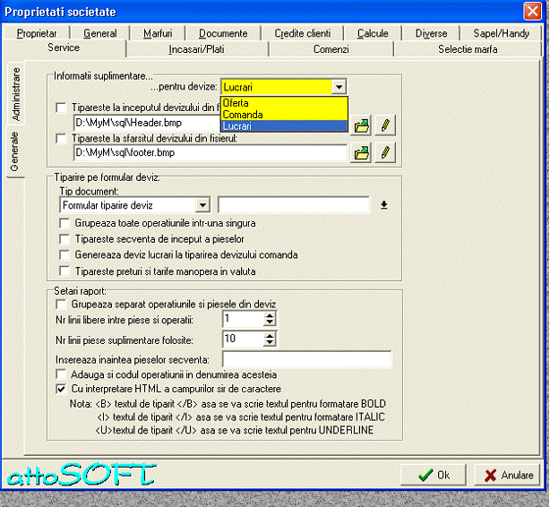 - Informatii suplimentare se vor complecta acele informatii care dorim sa apara in partea de sus si/sau jos, aceasta in functie de ce selectam in lista : lucrari, oferta, comanda