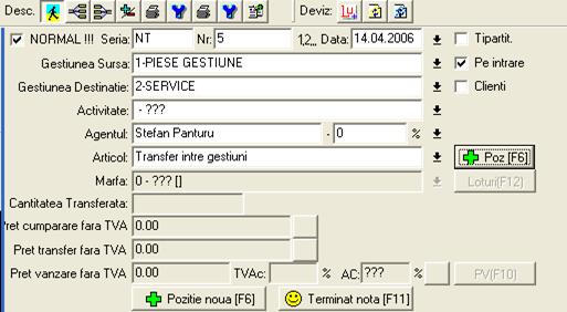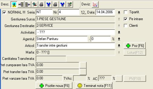 Se intra apoi in Service/ Transferuri piese pentru devize, se incepe nota de transfer (se completeaza antetul notei)