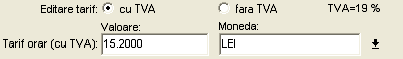 -se completeaza campul"Tarif orar ", valoarea acestuia in functie de ce ne alegem la Editare tarif , cu tva sau fara tva. Se completeaza campul"Moneda", se alege din lista moneda/valuta cu care lucram.