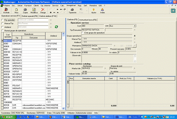 Asa cum am aratat in meniul "Operatiuni service", in momentul in care definim o operatiune putem insera tot atunci si piesele aferente acesteia.