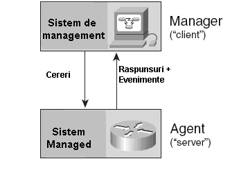 Astfel, comunicatia este asimetrica: o aplicatie de management joaca rolul de manager si un element de retea joaca rolul agentului care sustine manager-ul prin raspunsuri la cereri si notificari a unor evenimente neprevazute.
