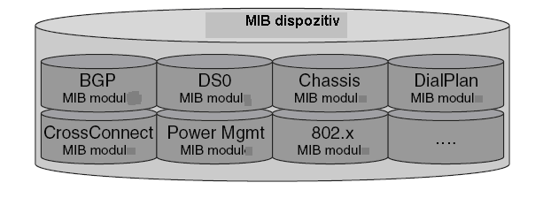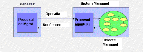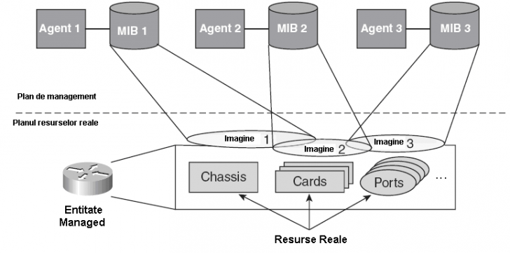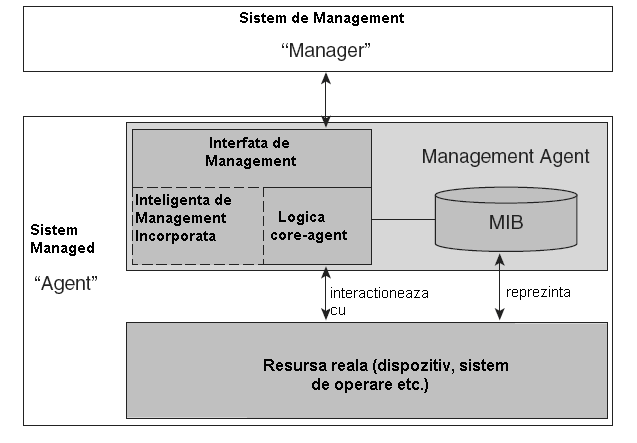 Agentul de management este format din 3 parti principale: interfata de management, MIB-ul (Management Information Base) si logica core agent: