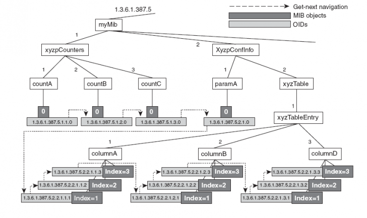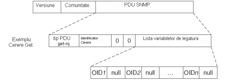 In exemplul de mai sus, s-a extras obiectul vectorial ifInterfaceTable al dispozitivului cu adresa IP: 11.127.50.10. Dupa cum s-a discutat mai devreme, o cerere get next este formata din urmatoarele: versiunea, un sir de caractere comunitate, un identificator de cerere, stare eroare si index eroare care sunt intotdeauna 0 pentru o astfel de cerere si lista variabilelor de legatura.