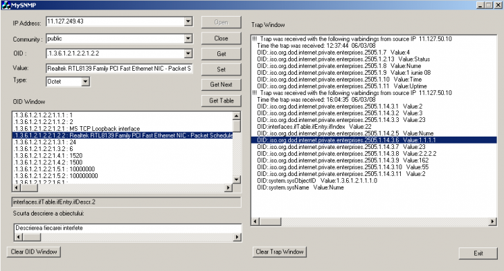 dedesubtul ferestrei OID va fi afisat OID-ul sub forma de string la fiecare operatie de tip: Get, Get Next, Get Table.