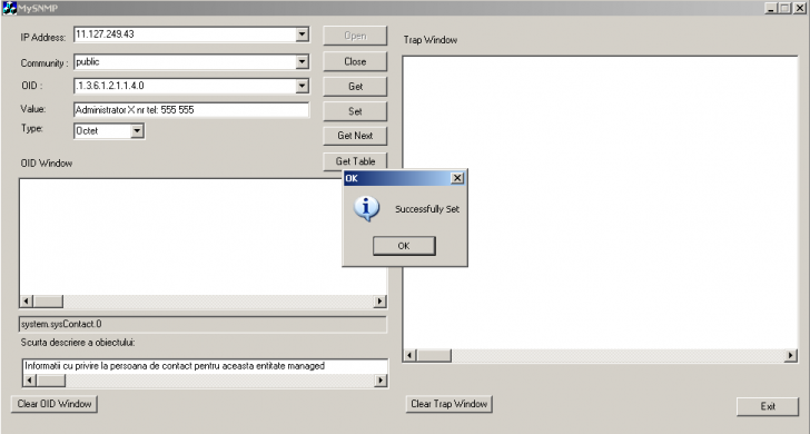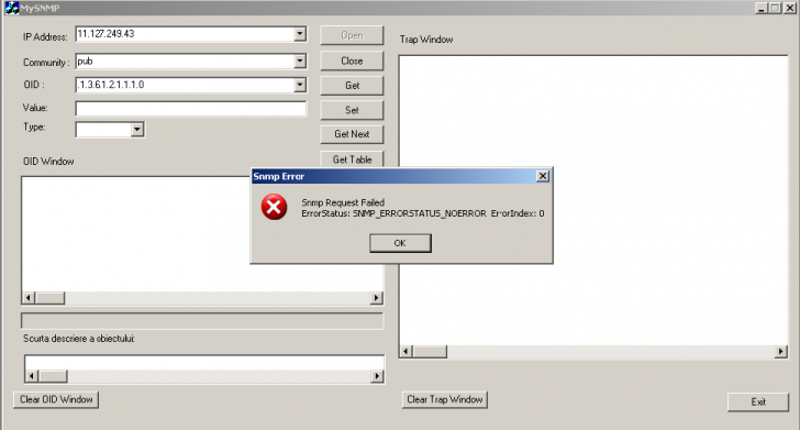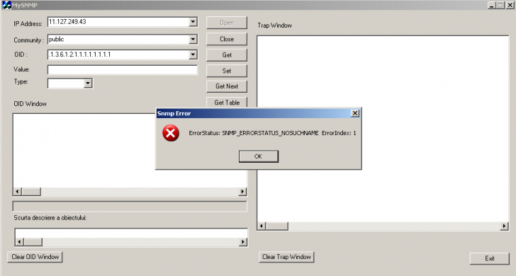 In caz pozitiv, se va extrage OID-ul introdus si va fi convertit din string in structura AsnObjectIdentifier. O cerere este trimisa catre agent. Agentul va procesa cererea si daca respectivul OID este suportat de dispozitiv, va trimite un mesaj Get Response cu valoarea obiectului solicitat. De asemenea, o descriere a obiectului va fi afisata in partea de jos a ecranului. In caz negativ, un mesaj de eroare va fi afisat: