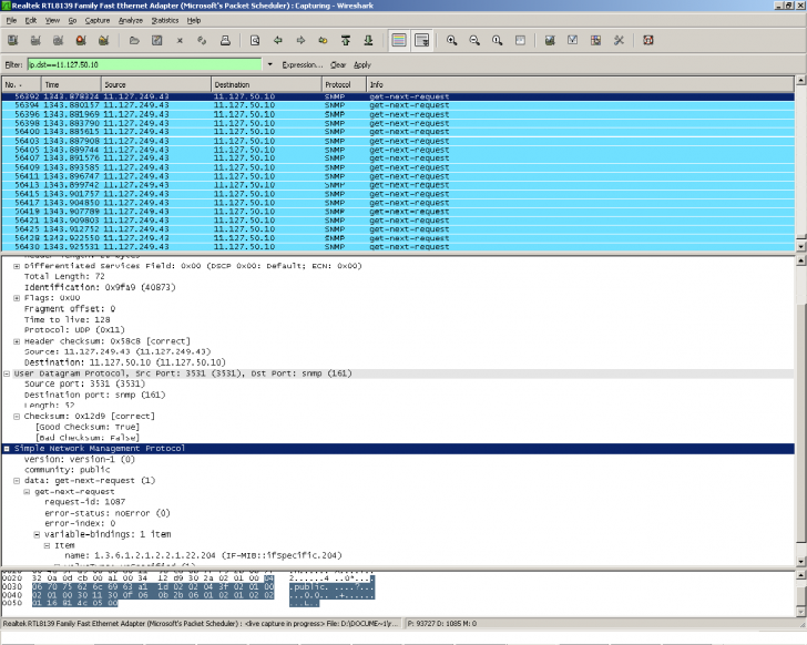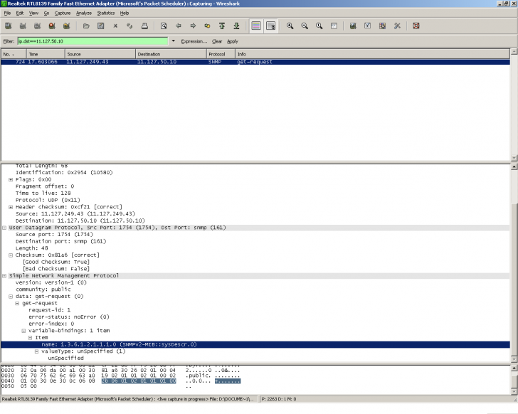 Schimbul de pachete intre agent si statia de management poate fi analizat la nivel de date folosind analizoare de pachete. Unul dintre cele mai cunoscute este Wireshark (fostul Ethereal). Astfel, pornind aplicatia sa asculte pe interfata activa a statiei de management si eventual setand un filtru pentru adresa destinatie a elementului de retea interogat, se pot observa pachetele UDP ce sunt schimbate intre dispozitive: