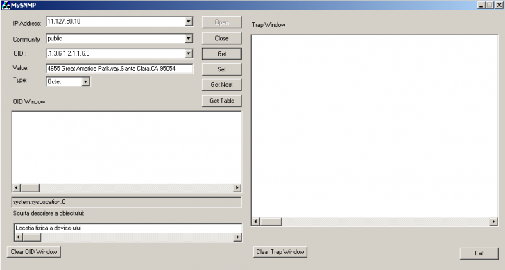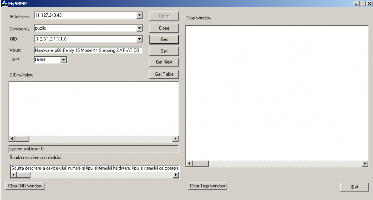 introducerea OID-ului obiectului care se doreste aflat. Acest OID poate fi introdus in forma sa numerica (exemplu: .1.3.6.1.2.1.1.1.0) sau in forma sa string (ex: system.sysDescr).